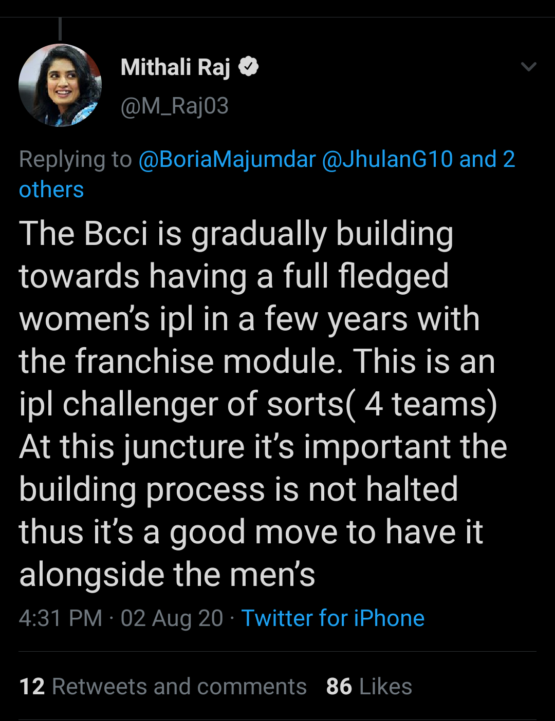 Another major development was seen yesterday. The BCCI president Sourav Ganguly confirmed to PTI that the women’s challenger series will be played from 1-10 November. He also mentioned that there will be a series with south africa in october for the women’s team and a tour to the west Indies post the Challenger series and later on the world cup down under if everything goes according to plan.