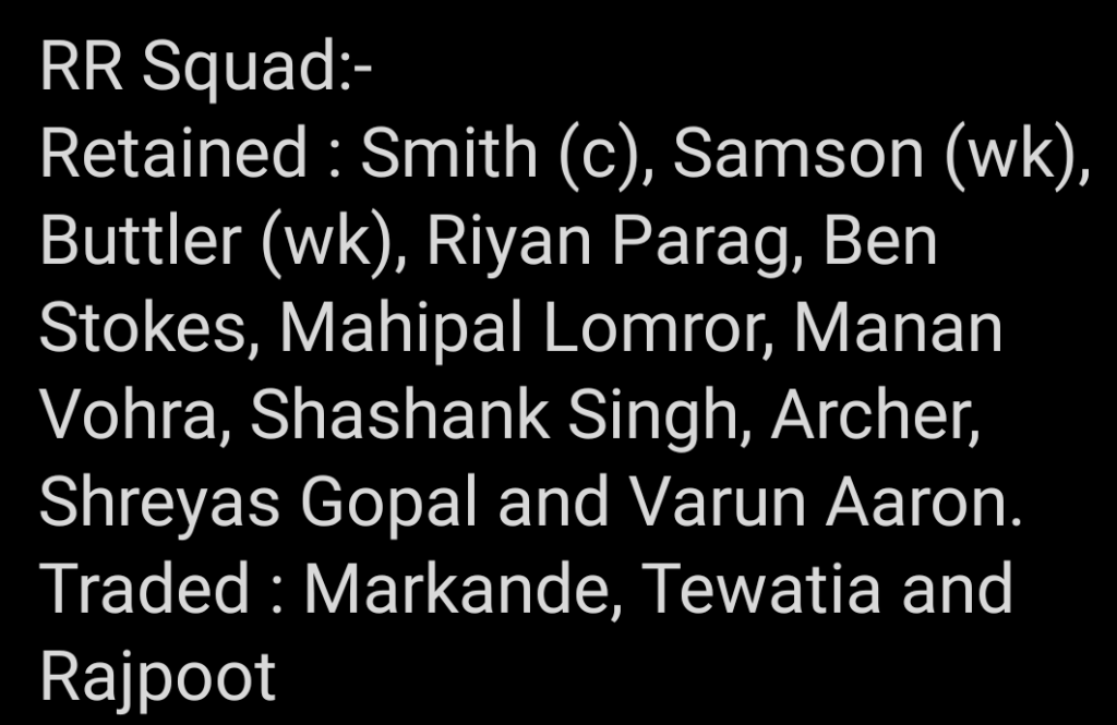 1. Jos Buttler (wk) 2. Sanju Samson 3. Steve Smith (c) 4. Stokes / David Miller 5. Shashank Singh 6. Riyan Parag 7. Rahul Tewatia 8. Shreyas Gopal 9. Jofra Archer 10. Rajpoot 11. Unadkat.