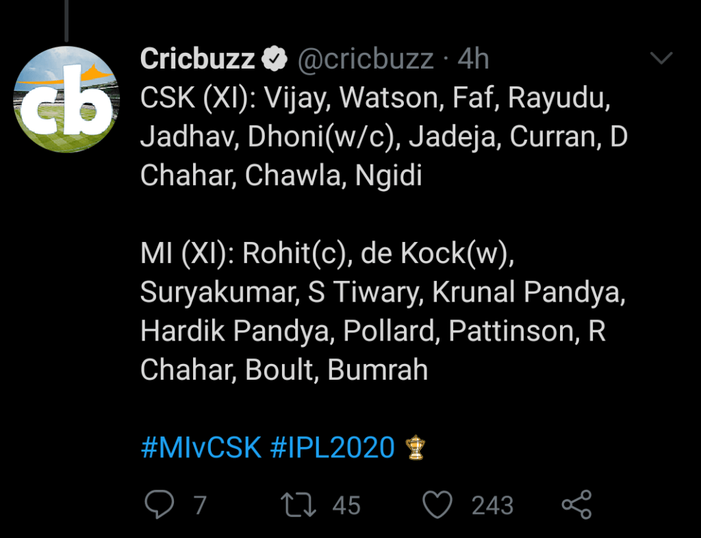 Toss : CSK won the toss and decided to have a bowl first.